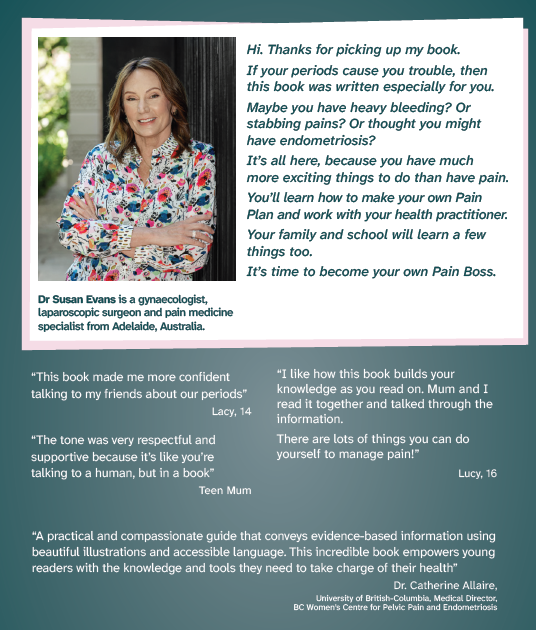 Navigating adolescence is challenging enough without the added burden of chronic pain! In When Periods Hurt – A guide to periods, pain and endometriosis for Teens, Dr Susan Evans, a renowned gynaecologist and pain specialist, provides a comprehensive guide tailored for young individuals grappling with period, pain and endometriosis and pelvic pain. This accessible resource delves into the complexities of endometriosis, offering insights into symptoms like painful periods, fatigue, and mood fluctuations. It equips readers with practical strategies for symptom management, including medical treatments, nutritional advice, and coping mechanisms.