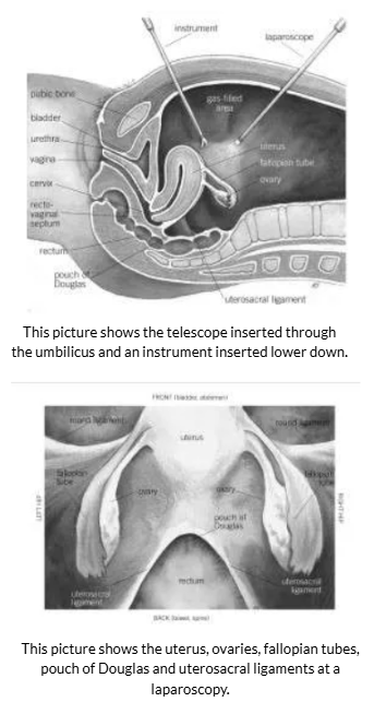 The pictures here show the telescope inserted into the abdomen, and what can be seen during the laparoscopy. A laparoscopy gives a good view of the pelvic organs.